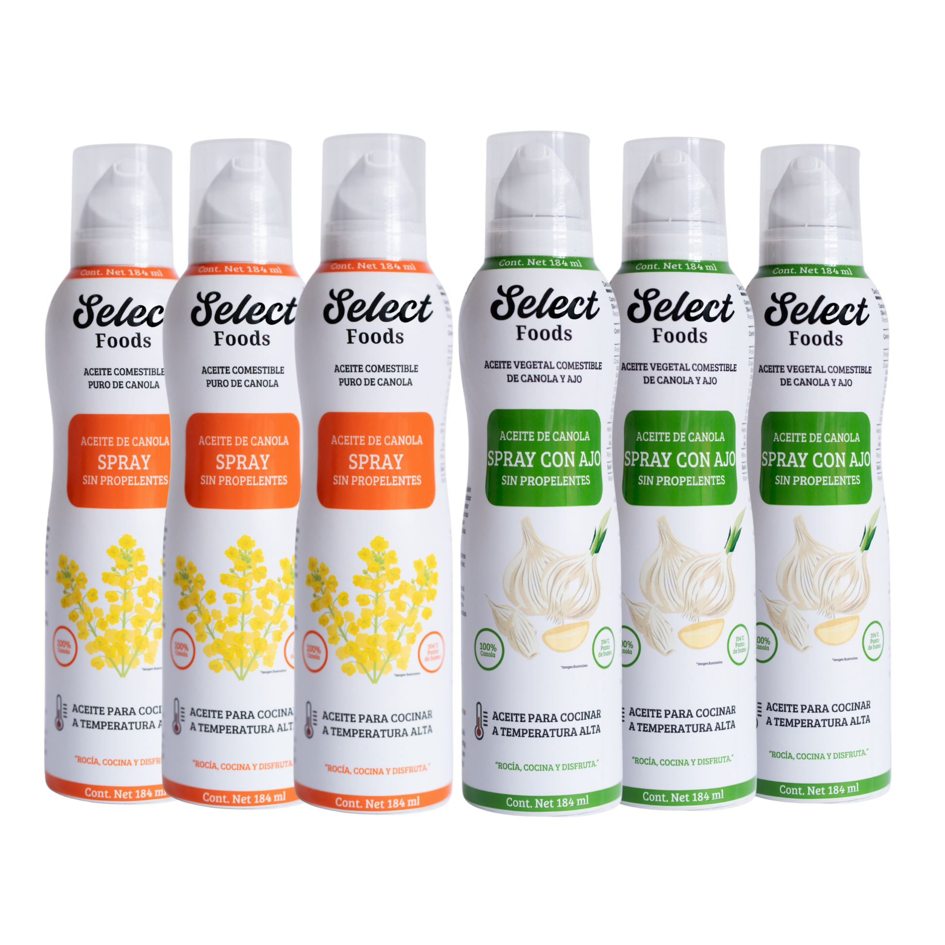 Disfruta el sabor y la practicidad de nuestros aceites en spray Select Foods con este paquete especial de 6 botellas: